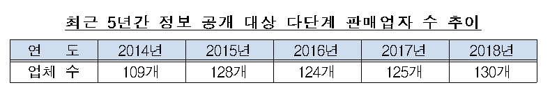 1. 2018년도에는 다단계 판매업자의 숫자가 전체 130개 업체로 전년도 125개에서 소폭 증가하였다.
