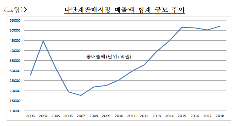 2018년도의 다단계 판매업자의 주요 정보 공개 내용을 보면 다단계 판매업체의 숫자와 총 매출액 및 후원수당 총액 등 모든 부분에 증가한 것으로 나타나고 있다.