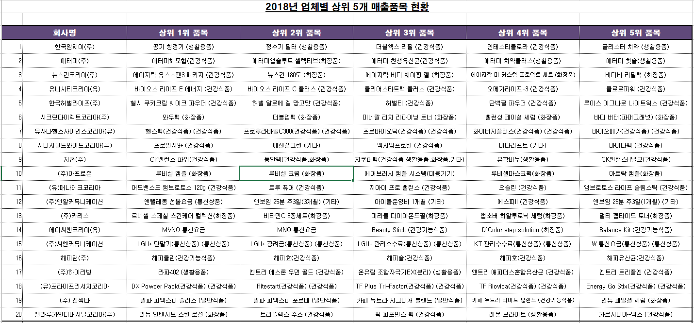 상위 20위이내 업체의 주요 매출품목을 클릭해서 천천히 보면 아마도 많이 듣던 제품들을 볼 수 있다. 속으로 어.. 이 업체가 이 품목을 파는 곳이었구나 하는 것을 알게 된다.