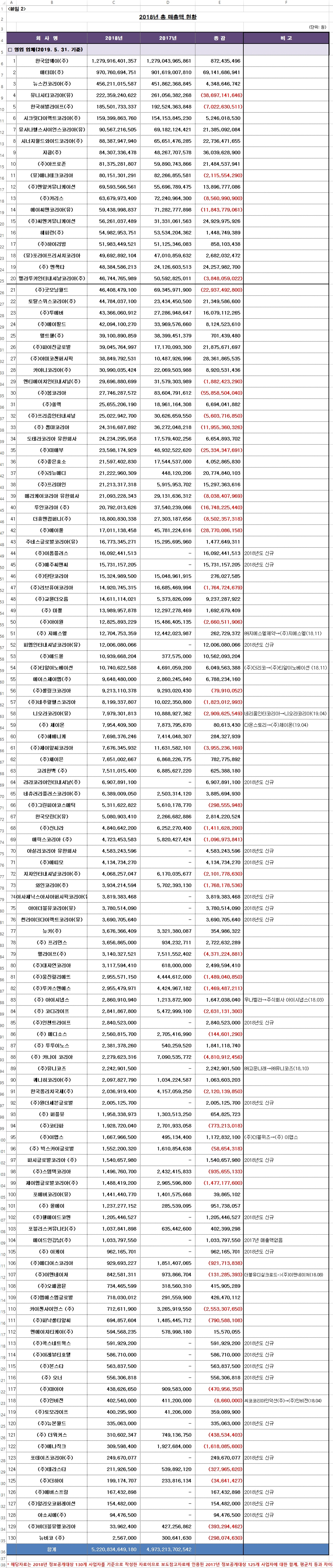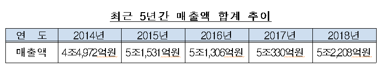 2. 매출액 합계는 5조 330억원(2017년도)에서 5조 2,208억원(2018년도)으로 약 3.7% 의 성장세를 보였다.