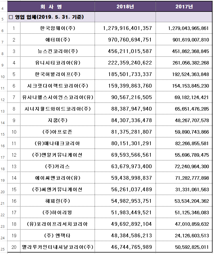 올해도 지난 7월 19일에 보도참고자료를 통해 다단계 판매업체의 매출액 순위를 발표하였다.