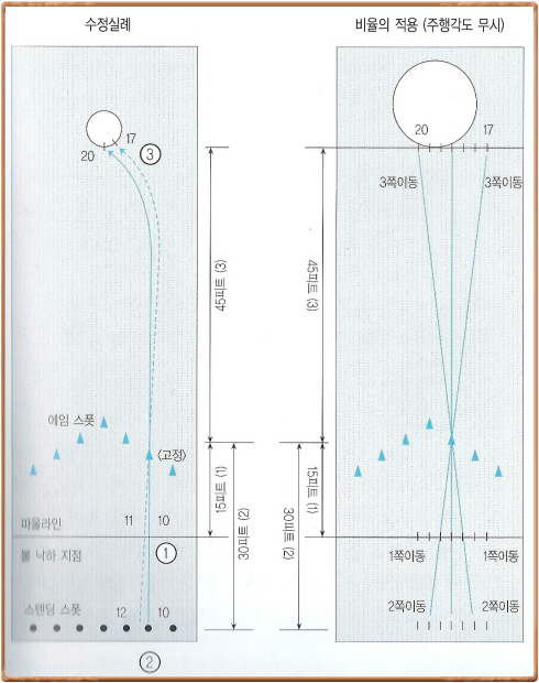 3/4앵글이라고 말하며 오른쪽 2번째에 있는 에임스팟을 통과하는 앵글로 훅의 기본코스이다.