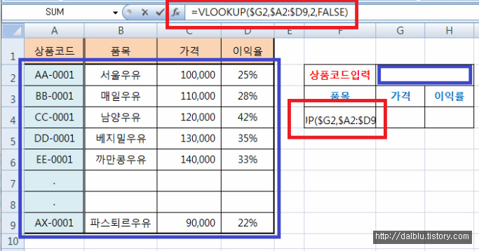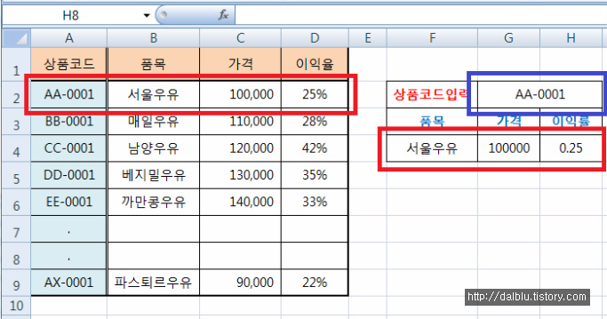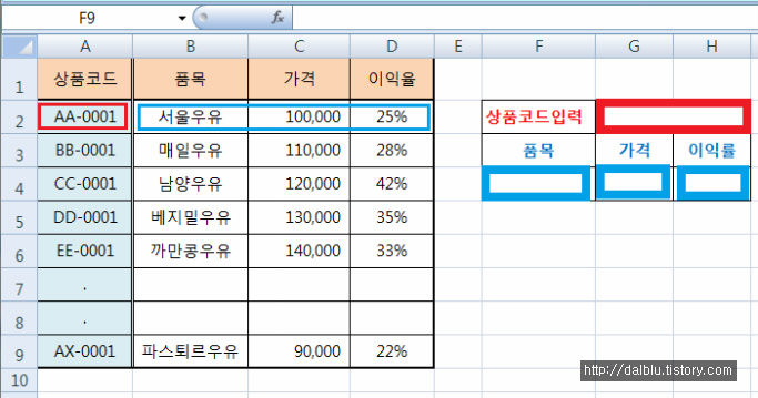 좌측편의 작은 표에 상품코드 AA-0001 을 입력했을때 아래 파란박스 3곳에 해당 데이터값이 자동으로 표시되도록 만드는 것을 가정하자.