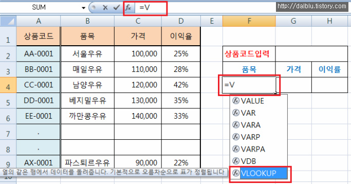 해당 상품을 입력했을때 표시되길 원하는 곳에 엑셀함수 =V를 입력하면 V로 시작하는 함수가 정렬된다. 이때 VLOOKUP을 더블클릭하거나 문자로 기입하면 된다.