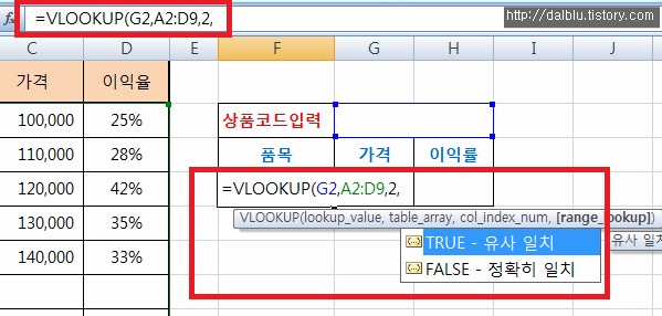range_lookup에서 TRUE는 비슷하거나 정확한 값, FALSE는 정확한 값만 찾을 것인지 결정한다.