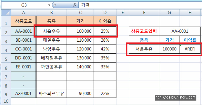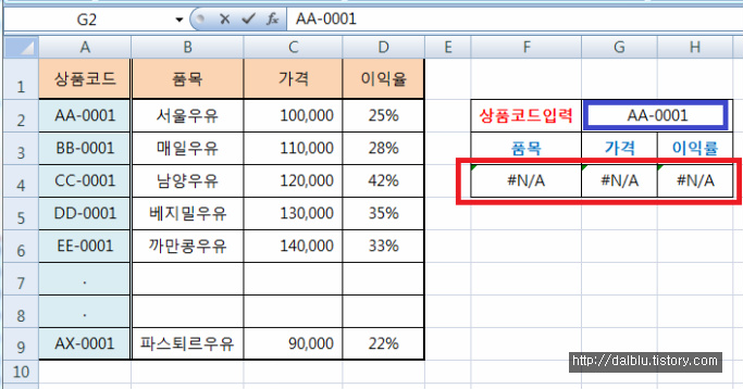 상품코드 AA-0001을 입력한다. 순번에 의하여 해당 값들이 표시되는지 확인하자. #REF! 와 같은 오류값이 표시되면 해당 칸의 VLOOKUP 사용법을 검사하여 수정한다.