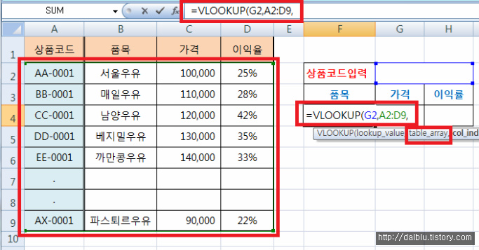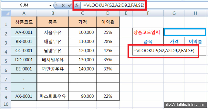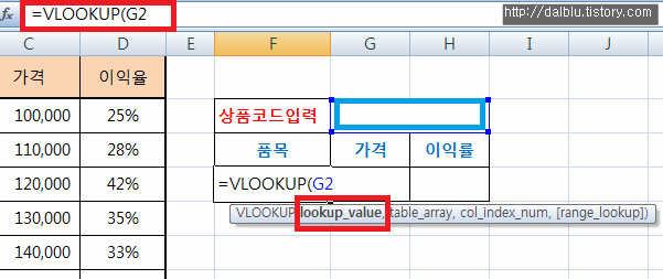 첫번째 조건이던 lookup_value를 표시한다. 품목이므로 상품이 표시되는 값을 찾자. 파란박스 G2에 상품코드를 입력하면 수치가 자동으로 표시되어야 하므로 첫번째 찾을 값은 G2 이며 이를 표기한다.