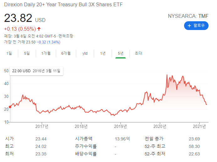 위 그림은 미국의 10년짜리 장기국채 ETF인 TMF의 주가그래프입니다.