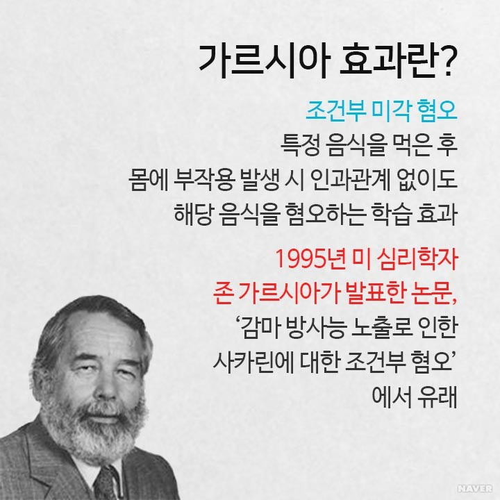 Garicia Effect 역시 사람과 동물은 자기의 생명을 위협하는 먹거리를 한번만 경험하여도 조건반사적으로 이를 놀랍도록 터득하는 놀라운 재능이 있다고 보는 것이다.