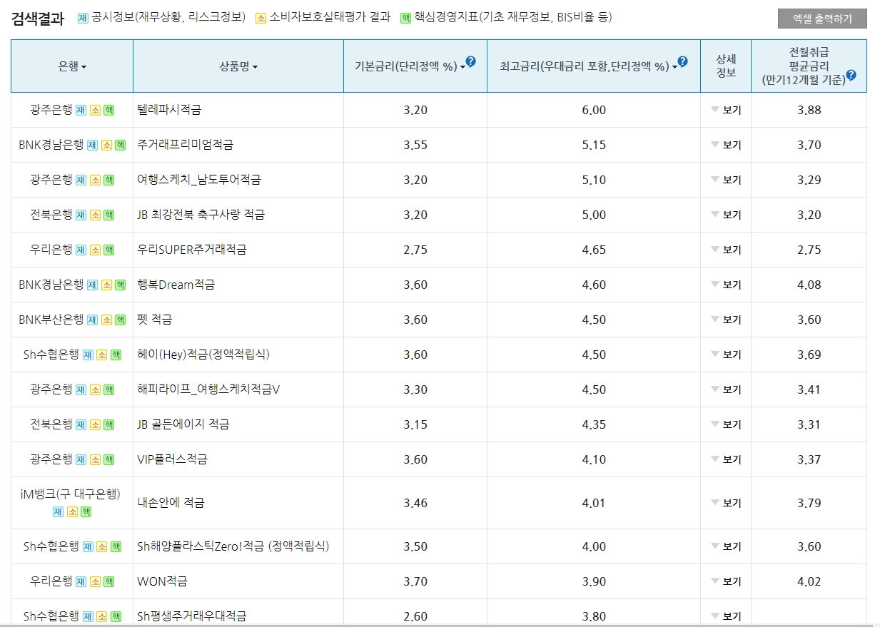 이 검색기능으로 매일 매일의 최신 적금 금리를 확인할 수 있는 장점과 검색결과를 엑셀파일로 출력할 수도 있으므로 여러가지 편리함을 제공해 준다. 또한 각 상품별로 세부항목과 조건도 알 수 있다는 점이 좋다. 금리를 알아보는 시간과 비용까지도 절약해 줄 수 있는 은행연합회 홈페이지 검색기능을 적극 활용해보자.