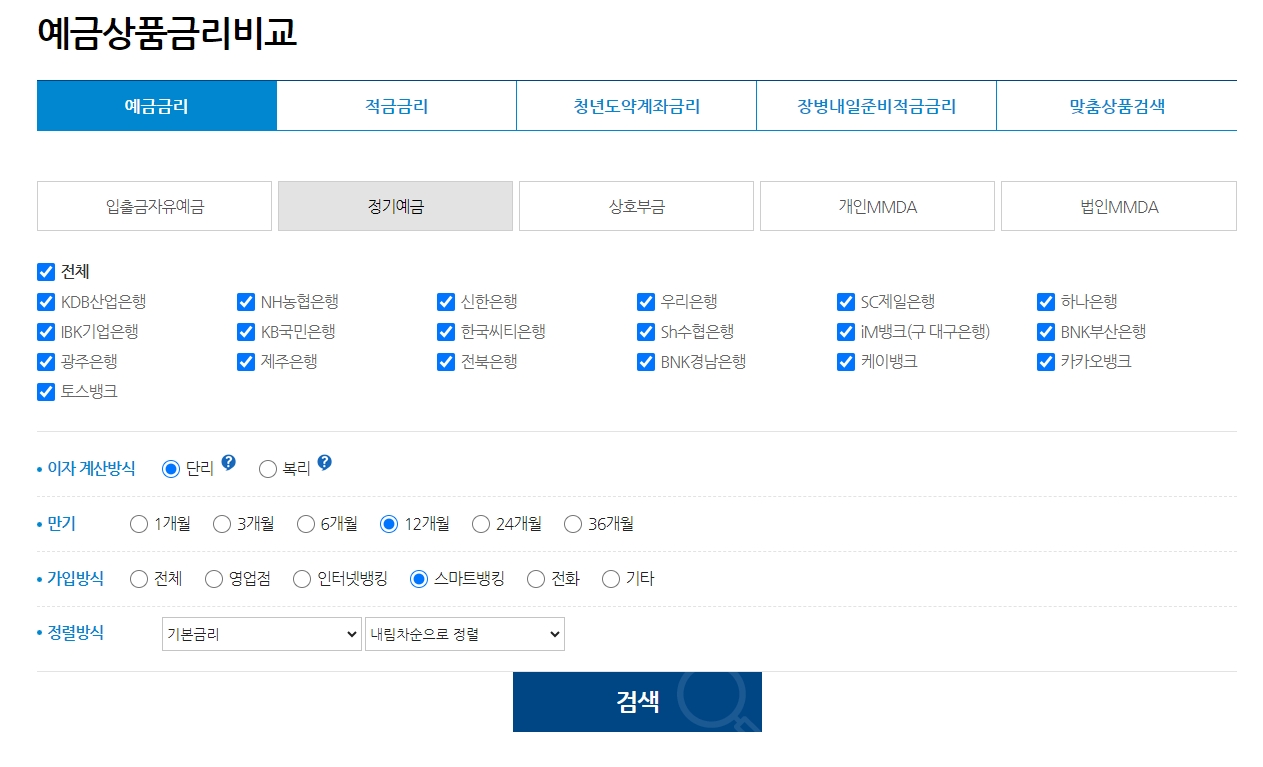 적금 상품을 상세하게 검색할 수 있는 페이지로 왔다. 여기서는 이미 입력했던 내용이 반영되어 있는데 전체은행으로 매월 불입하는 정액제를 선택하였고 이자는 단리를 기준으로 하였다. 만기는 12개월로 하였으며 통장 개설은 직접 방문부터 스마트뱅킹으로 가입하는 방법까지 모두를 적용하였다.