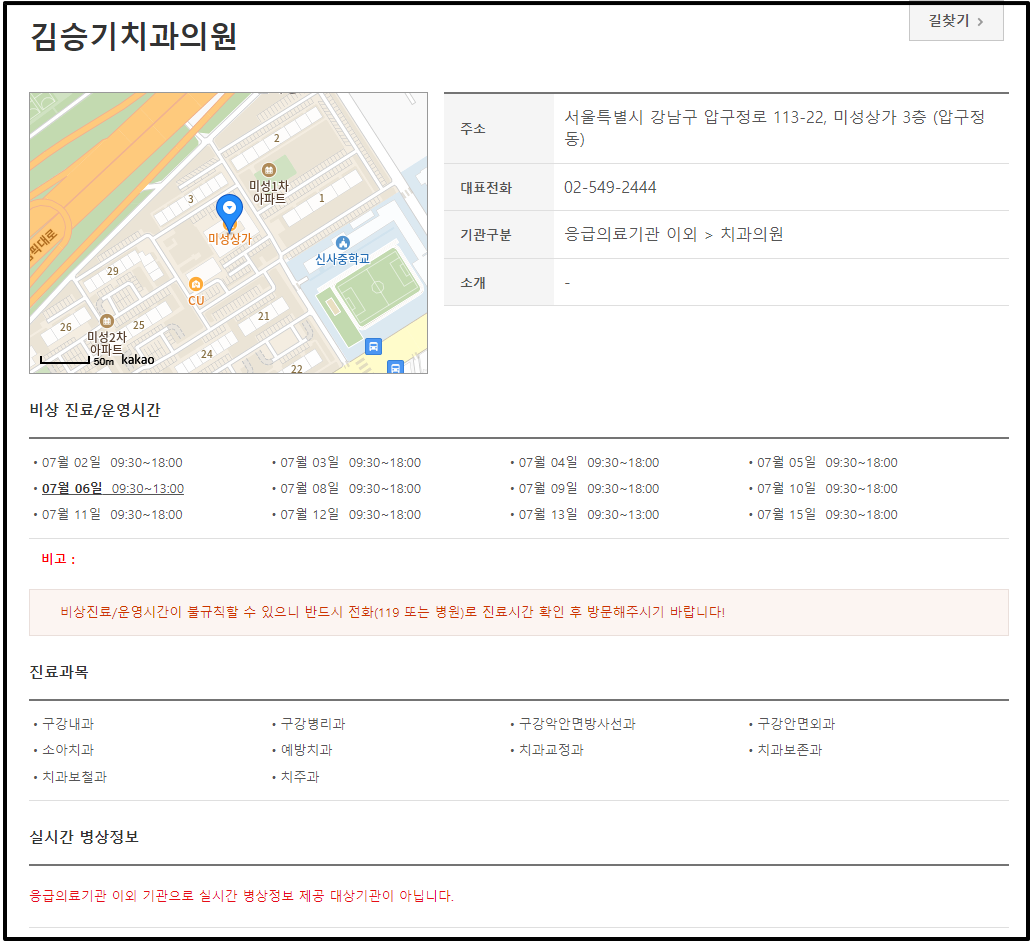 병의원 검색목록의 가장 상단에 있는 김승기치과의원의 상세보기를 클릭하면 소개 페이지로 이동한다. 압구정동 미성아파트 상가에 위치하고 있으며 전화번호와 비상 진료 및 운영시간을 알 수 있다.