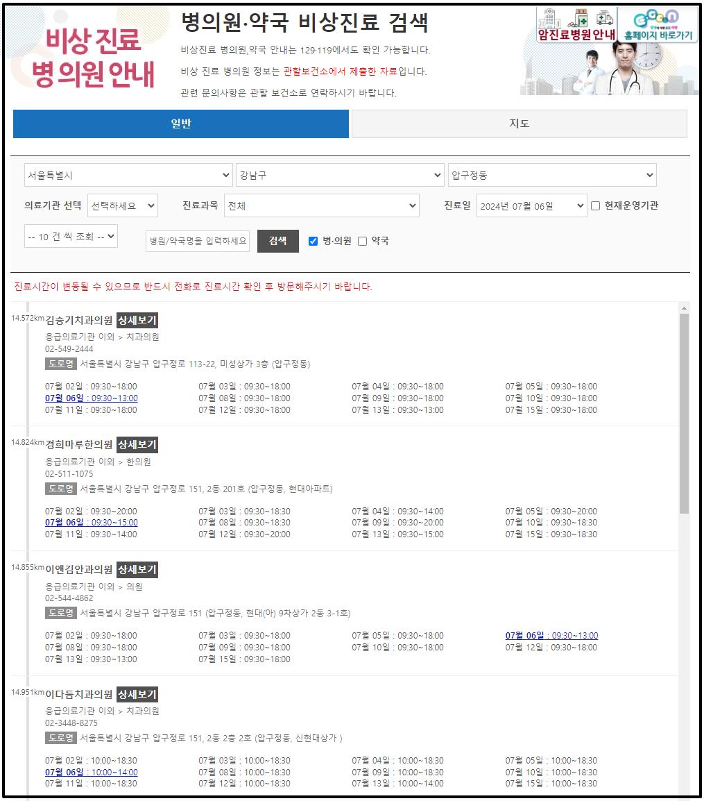 서울 강남의 압구정동을 검색하면 주말이나 휴일에 비상진료를 하고 있는 병.의원들이 모두 표시된다. 원하는 병원과 진료과목을 확인한 후에 <상세보기>를 클릭하면 해당 병원에 대한 간단한 소개란이 열린다.