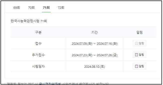 71회 시험을 위한 접수일정은 7/9~7/16까지이며 추가접수는 7/23~7/26까지 진행된다. 시험일시는 2024. 8. 10.(토)에 실시한다.