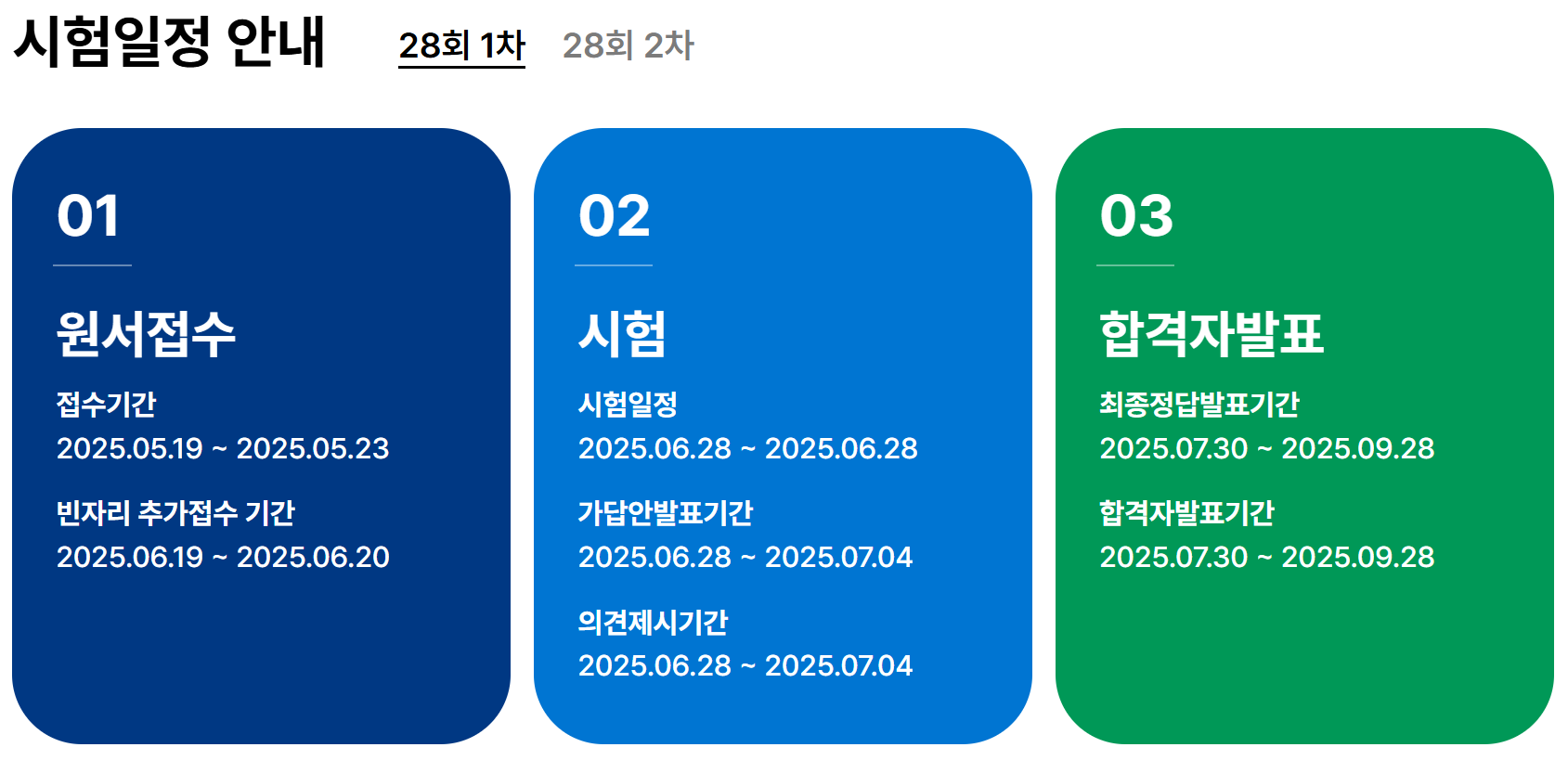 2025년도 주택관리사(보) 시험일정과 시험과목을 간단히 알아보겠습니다. 이번 시험은 주택관리사 28회 시험으로 1차 시험은 원서 접수는 5월 중순에 있습니다. 대망의 1차시험은 6월 28일이며 합격자 발표는 7월 30일입니다.
