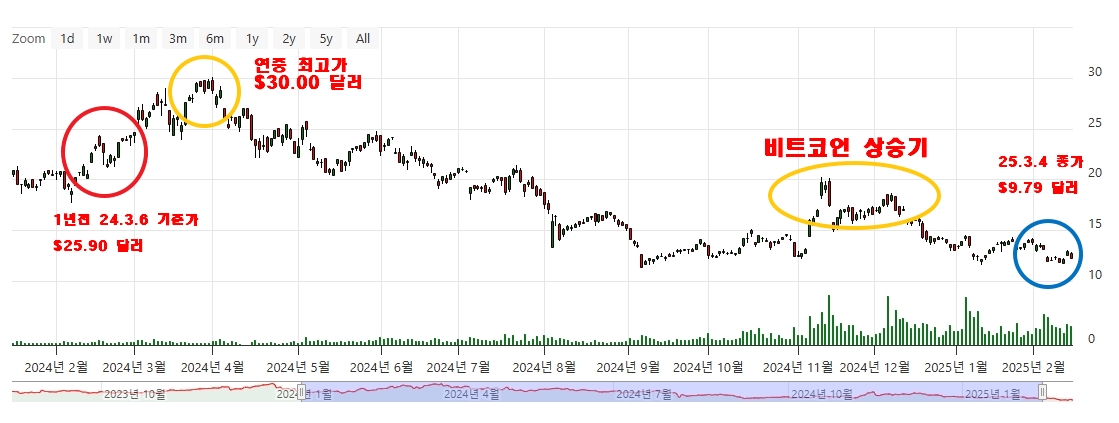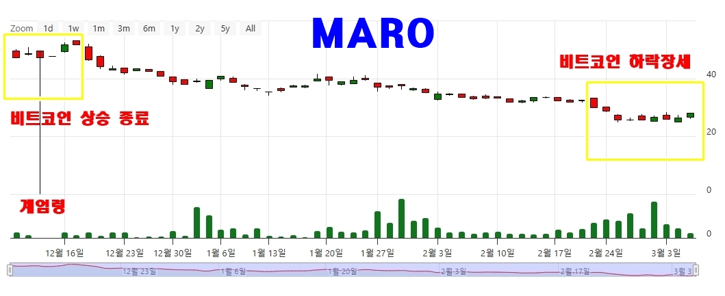 위 그래프를 봐도 알 수 있듯이 비트코인의 대세 상승기였던 지난 해 10월~12월 초순에 주가의 하락폭이 극대화된 모습을 보여주고 있습니다.