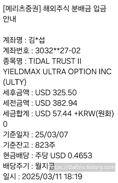3. ULTY는 배당락일에 823주를 보유한 상태에서 배당금으로 세후 325달러를 수령했습니다. ULTY도 이번 미국 증시 폭락사태의 영향을 받아 평가금액 손실이 약 22%에 달하는 상태입니다. 지금은 주식의 50% 정도를 처분해 매입금액 500만원에 세팅해 놨으며, 매도한 금액은 내일 배당되는 MSTY를 사놓았습니다.