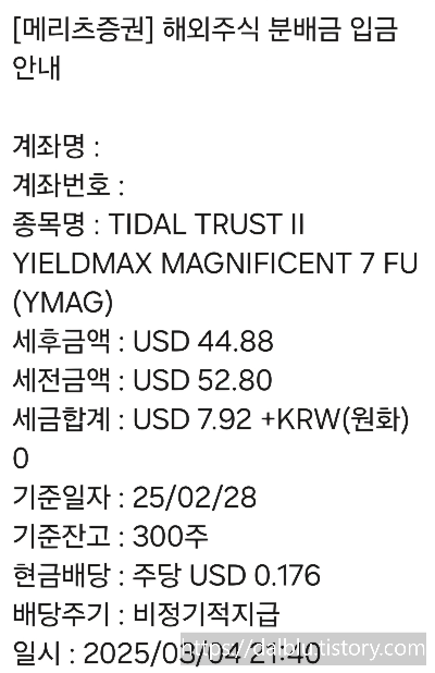 1. YMAG는 일드맥스 주배당 종목입니다. 지난 주와 이번 주에 2회를 받았는데 소액이므로 계좌에 그대로 보관하고 있었습니다. 첫주에는 세후 44달러를, 이번 주에는 38달러를 받아서 2주간 합계액은 82달러입니다.