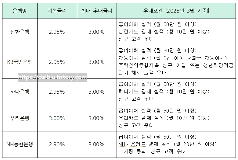 - 급여이체 우대 : 급여를 해당 은행 계좌로 받으면 추가 금리 제공