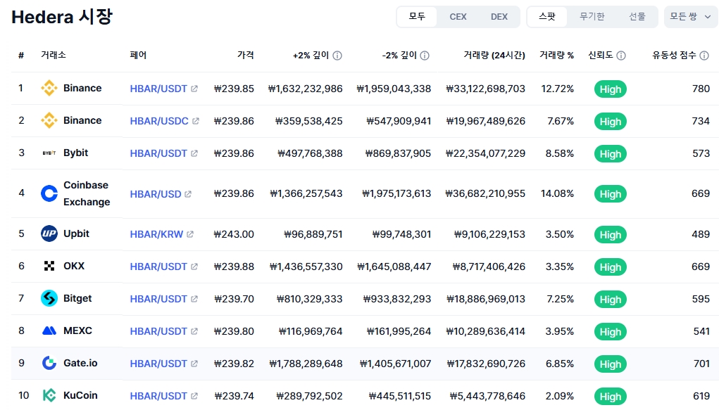 헤데라는 대부분의 거래소에 상장되어 있어 접근성이 편리한 코인 중 하나입니다. 바이낸스 거래소에서 약 20% 정도 물량이 거래되고 있으며, 우리나라의 업비트 거래소는 전체 거래물량 중 3.5%를 점유하고 있어 약간 미미한 수준을 보이고 있습니다.