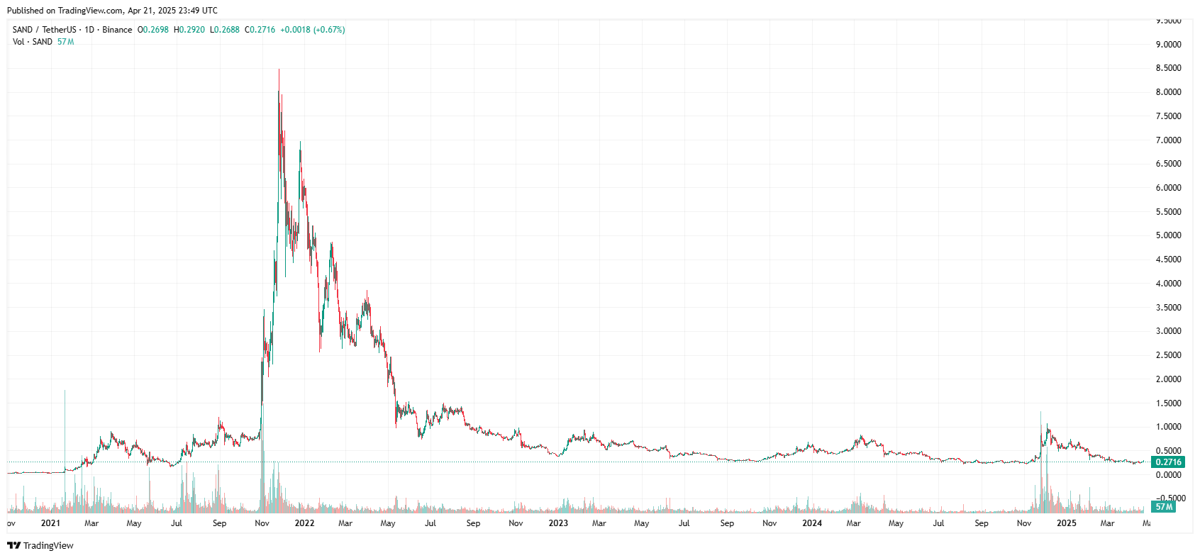 2025년 4월 기준, 샌드박스 시세는 약 0.54달러 수준에서 거래되고 있으며 최근 24시간 거래량은 2억 달러를 돌파하였습니다. 작년 11월에 전고점을 찍은 이후 12월부터 이어지던 하락추세가 일단 멈추었습니다.