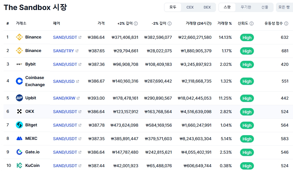 샌드박스 SAND 코인은 주요 거래소에 상장되어 있으며 바이낸스 거래소에서 전체 물량의 15% 정도가 거래되고 있습니다. 우리 나라의 업비트 거래소의 거래물량은 11.25%로 전체 거래소 중 2위를 점유하고 있습니다.