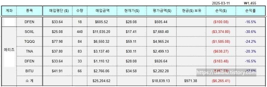 은둔형 외톨이도 오늘 공개하는 무매 투자를 하기 전에 먼저 SOXL(반도체 3배 레버리지 ETF) 820주를 1주당 $25에 매수했어요. 지금은 쫄딱 망해서 마이너스 30% 손실을 보고 있지만 트럼프가 얌전하던 2월 중순경에는 30%까지 수익이 올라가면서 매도를 준비하다가 급락을 피하지 못하고 유탄을 맞고 쓰러졌습니다.