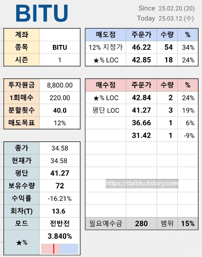레버러지 3배 상품을 선택한 후 한 종목당 투자금액을 미리 배분합니다. 이를 40회차로 나누어 매일같이 매입하는 투자방법으로 이동 평균가격을 지향하면서 미리 정한 상승률 10~12%에 도달하면 매도하는 방식으로 라오어님이 투자방법을 따릅니다.