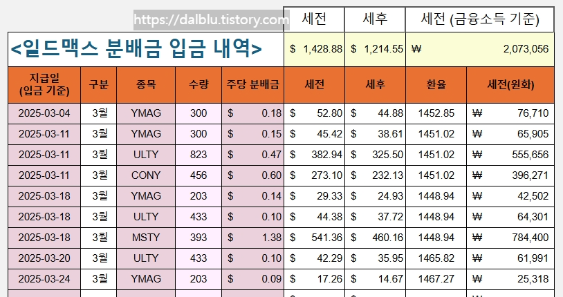 5-1) 3월 한달간 지급받은 배당금은 세후 약 1,214달러이며, 세전으로는 약 1,428달러(207만원)입니다.